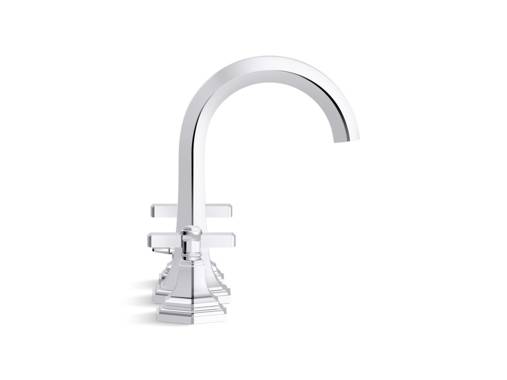 Marrying intricate details with superior function, the For Town tall spout sink faucet with cross handles brings classic elegance to any bathing space. The sweeping arched neck is faceted to pick up and reflect light while flaring out as it terminates to a stepped base. The faucet features a grander deck-to-aerator design, creating more functional space under the faucet spout.- High-quality solid-brass construction for durability and reliability