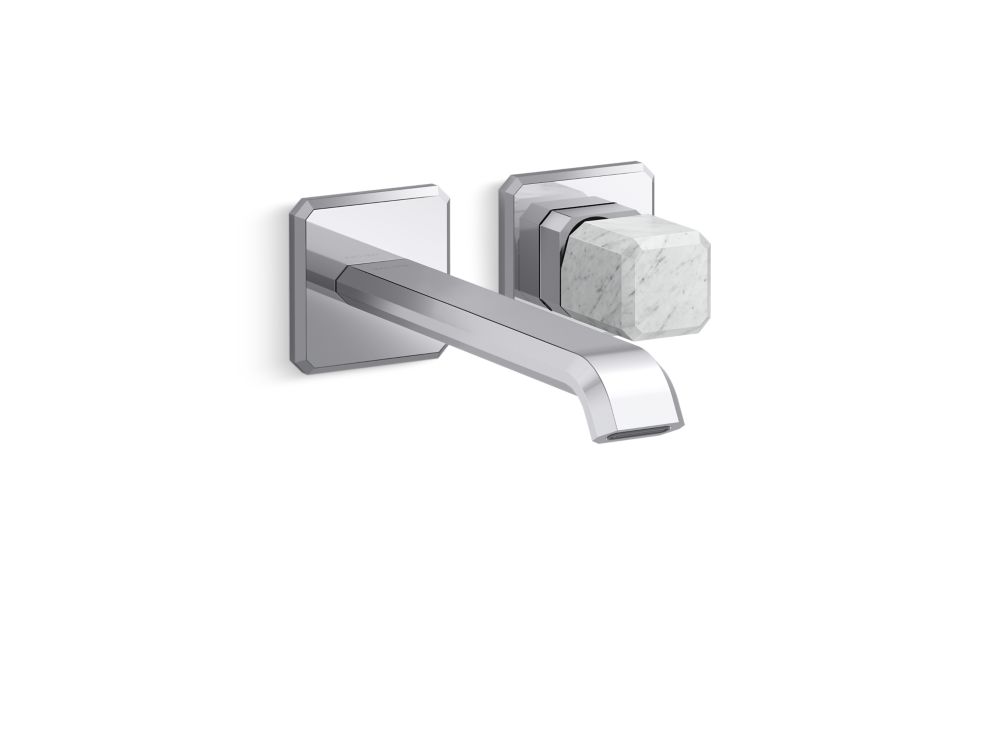 Showcasing Kallista’s first soft square profile intricately faceted in the likeness of a gem stone, the Bezel™ collection features an Art Deco-inspired silhouette, elevated natural stone adornments and a precision cut contour tempered by classical composition. The result is a luxurious, versatile and classic aesthetic, developed to endure the test of time. Kallista is proud to introduce Bezel™ in partnership with Italian manufacturer CRISTINA Rubinetterie and creative industrial design team Busetti Garuti Redaelli. A distinguishing focal point for the discerning eye, this wall mounted single control sink faucet with elongated spout, adorned with a striking Italian statuary White Carrara natural stone handle, is the ultimate statement in both stature and refined detail. Due to the natural properties of the stone, coloring may vary.