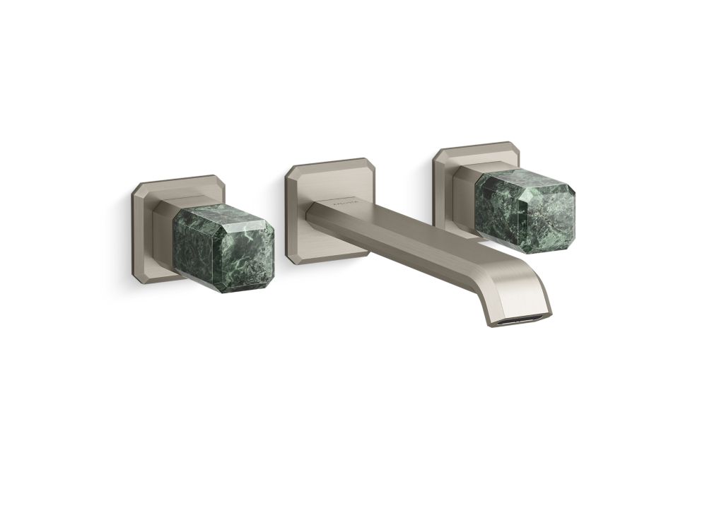 Showcasing Kallista’s first soft square profile intricately faceted in the likeness of a gem stone, the Bezel™ collection features an Art Deco-inspired silhouette, elevated natural stone adornments and a precision cut contour tempered by classical composition. The result is a luxurious, versatile and classic aesthetic, developed to endure the test of time. Kallista is proud to introduce Bezel™ in partnership with Italian manufacturer CRISTINA Rubinetterie and creative industrial design team Busetti Garuti Redaelli. A distinguishing focal point for the discerning eye, this wall mount widespread sink faucet with elongated spout, adorned with striking Guatemala natural stone handles, is the ultimate statement in both stature and refined detail. Due to the natural properties of the stone, coloring may vary.- High-quality solid-brass construction for durability and reliability