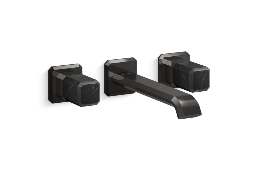 Showcasing Kallista’s first soft square profile intricately faceted in the likeness of a gem stone, the Bezel™ collection features an Art Deco-inspired silhouette, elevated natural stone adornments and a precision cut contour tempered by classical composition. The result is a luxurious, versatile and classic aesthetic, developed to endure the test of time. Kallista is proud to introduce Bezel™ in partnership with Italian manufacturer CRISTINA Rubinetterie and creative industrial design team Busetti Garuti Redaelli. A distinguishing focal point for the discerning eye, this wall mount widespread sink faucet with elongated spout, adorned with striking Italian Nero Marquina natural stone handles, is the ultimate statement in both stature and refined detail. Due to the natural properties of the stone, coloring may vary.- High-quality solid-brass construction for durability and reliability
