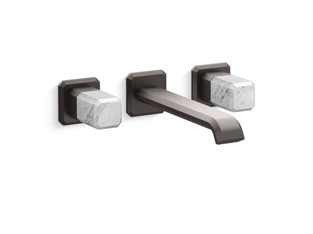 Showcasing Kallista’s first soft square profile intricately faceted in the likeness of a gem stone, the Bezel™ collection features an Art Deco-inspired silhouette, elevated natural stone adornments and a precision cut contour tempered by classical composition. The result is a luxurious, versatile and classic aesthetic, developed to endure the test of time. Kallista is proud to introduce Bezel™ in partnership with Italian manufacturer CRISTINA Rubinetterie and creative industrial design team Busetti Garuti Redaelli. A distinguishing focal point for the discerning eye, this wall mount widespread sink faucet with elongated spout, adorned with striking Italian statuary White Carrara natural stone handles, is the ultimate statement in both stature and refined detail. Due to the natural properties of the stone, coloring may vary.- High-quality solid-brass construction for durability and reliability
