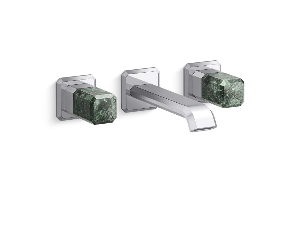 Showcasing Kallista’s first soft square profile intricately faceted in the likeness of a gem stone, the Bezel™ collection features an Art Deco-inspired silhouette, elevated natural stone adornments and a precision cut contour tempered by classical composition. The result is a luxurious, versatile and classic aesthetic, developed to endure the test of time. Kallista is proud to introduce Bezel™ in partnership with Italian manufacturer CRISTINA Rubinetterie and creative industrial design team Busetti Garuti Redaelli. A distinguishing focal point for the discerning eye, this wall mount widespread sink faucet, adorned with striking green Guatemala natural stone handles, is the ultimate statement in both stature and refined detail. Due to the natural properties of the stone, coloring may vary.- High-quality solid-brass construction for durability and reliability
