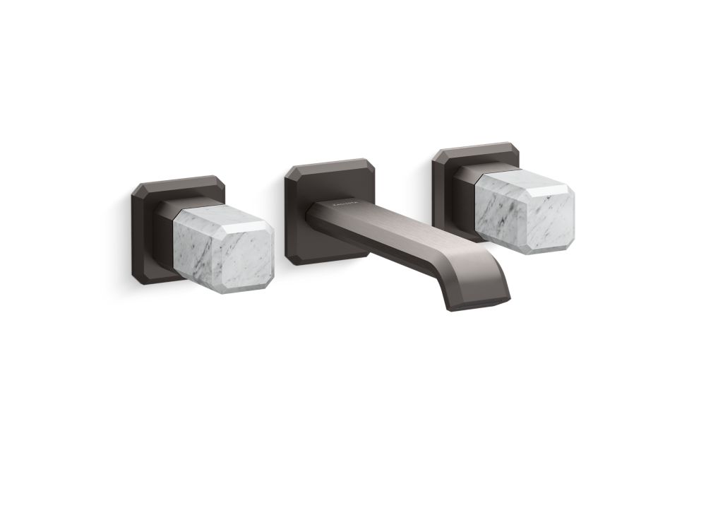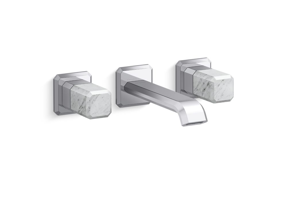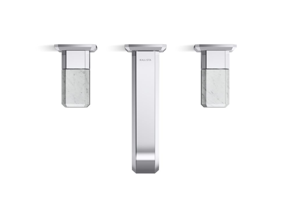 Showcasing Kallista’s first soft square profile intricately faceted in the likeness of a gem stone, the Bezel™ collection features an Art Deco-inspired silhouette, elevated natural stone adornments and a precision cut contour tempered by classical composition. The result is a luxurious, versatile and classic aesthetic, developed to endure the test of time. Kallista is proud to introduce Bezel™ in partnership with Italian manufacturer CRISTINA Rubinetterie and creative industrial design team Busetti Garuti Redaelli. A distinguishing focal point for the discerning eye, this wall mount widespread sink faucet, adorned with striking Italian statuary White Carrara natural stone handles, is the ultimate statement in both stature and refined detail. Due to the natural properties of the stone, coloring may vary.- High-quality solid-brass construction for durability and reliability