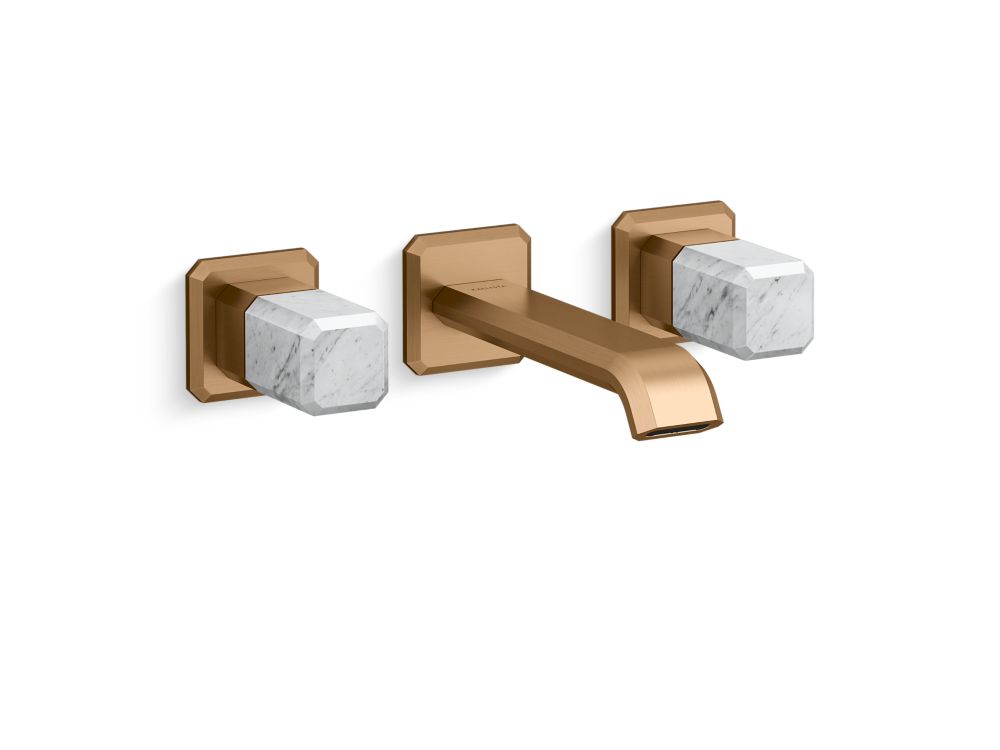Showcasing Kallista’s first soft square profile intricately faceted in the likeness of a gem stone, the Bezel™ collection features an Art Deco-inspired silhouette, elevated natural stone adornments and a precision cut contour tempered by classical composition. The result is a luxurious, versatile and classic aesthetic, developed to endure the test of time. Kallista is proud to introduce Bezel™ in partnership with Italian manufacturer CRISTINA Rubinetterie and creative industrial design team Busetti Garuti Redaelli. A distinguishing focal point for the discerning eye, this wall mount widespread sink faucet, adorned with striking Italian statuary White Carrara natural stone handles, is the ultimate statement in both stature and refined detail. Due to the natural properties of the stone, coloring may vary.- High-quality solid-brass construction for durability and reliability
