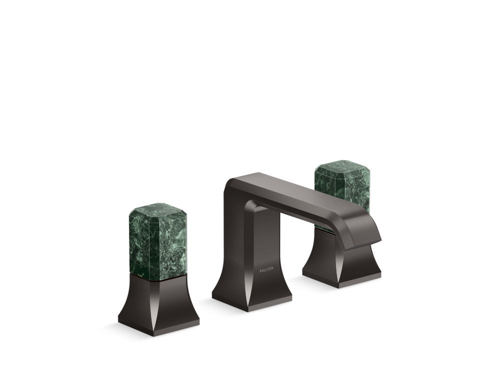 Showcasing Kallista’s first soft square profile intricately faceted in the likeness of a gem stone, the Bezel™ collection features an Art Deco-inspired silhouette, elevated natural stone adornments and a precision cut contour tempered by classical composition. The result is a luxurious, versatile and classic aesthetic, developed to endure the test of time. Kallista is proud to introduce Bezel™ in partnership with Italian manufacturer CRISTINA Rubinetterie and creative industrial design team Busetti Garuti Redaelli. A distinguishing focal point for the discerning eye, this widespread sink faucet adorned with striking green Guatemala natural stone handles, is the ultimate statement in both stature and refined detail. Due to the natural properties of the stone, coloring may vary.- High-quality solid-brass construction for durability and reliability