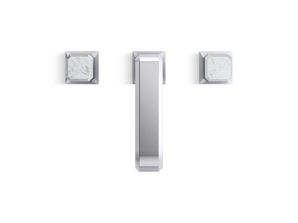 Showcasing Kallista’s first soft square profile intricately faceted in the likeness of a gem stone, the Bezel™ collection features an Art Deco-inspired silhouette, elevated natural stone adornments and a precision cut contour tempered by classical composition. The result is a luxurious, versatile and classic aesthetic, developed to endure the test of time. Kallista is proud to introduce Bezel™ in partnership with Italian manufacturer CRISTINA Rubinetterie and creative industrial design team Busetti Garuti Redaelli. A distinguishing focal point for the discerning eye, this widespread sink faucet adorned with Italian statuary White Carrara natural stone handles, is the ultimate statement in both stature and refined detail. Due to the natural properties of the stone, coloring may vary.- High-quality solid-brass construction for durability and reliability