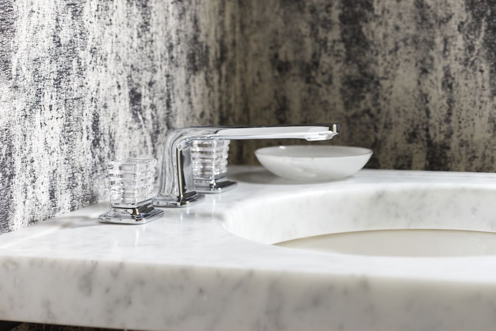 The premium Per Se Decorative bathroom sink faucet features a slender profile and soft curves that embrace modern minimalism. An exquisite work of art, featuring hand-cut, ribbed Saint-Louis crystal handles and a sleek spout, this luminous widespread faucet makes a statement in any contemporary or transitional bathroom space.- Extended lead time, please contact KALLISTA customer service (888-452-5547) for availability. Product is not available for commercial specification at this time