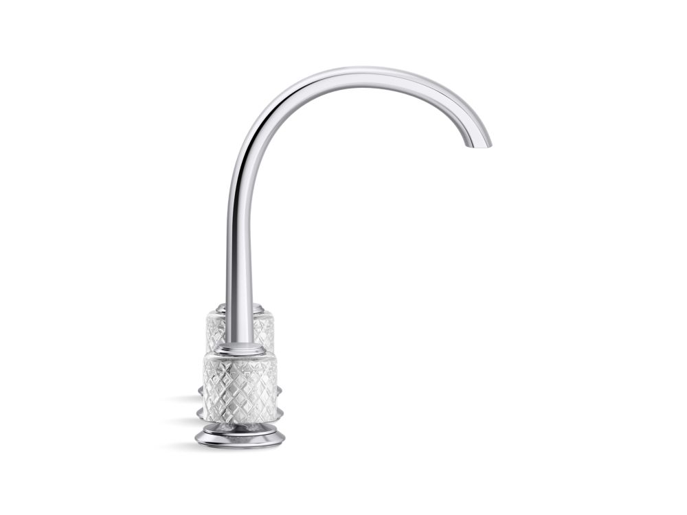 Accented with luminous crisscross-etched clear crystal from esteemed French crystallerie Saint-Louis, the strikingly approachable Script Decorative sink faucet with knob handles and arch spout offers unparalleled elegance, artisan craftsmanship, and exquisite materials to elevate your everyday use. The decadent widespread faucet was designed to make a statement in any traditional or transitional bathroom space.- Hand-cut French crystal knobs by Saint-Louis