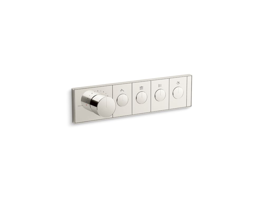 Thermostatic technology allows you to maintain consistent temperature and flow control for the ultimate shower experience. This sleek thermostatic valve control panel with recessed push buttons is designed for use with a Kallista four-port thermostatic valve. The trim plate includes a temperature control knob with integrated adjustable high-temperature limit stop as well as shower outlet activation buttons that pop out for the adjustment of water flow (up to 8 gpm). Available in all Kallista finishes.- Trim plate includes temperature control knob with integrated adjustable high-temperature limit stop and shower outlet on/off buttons