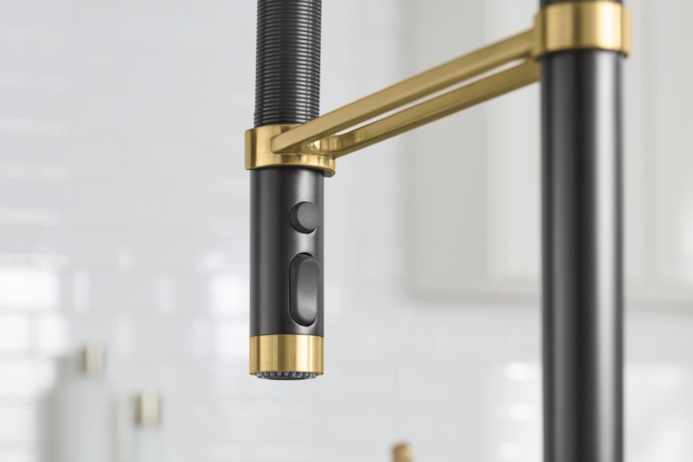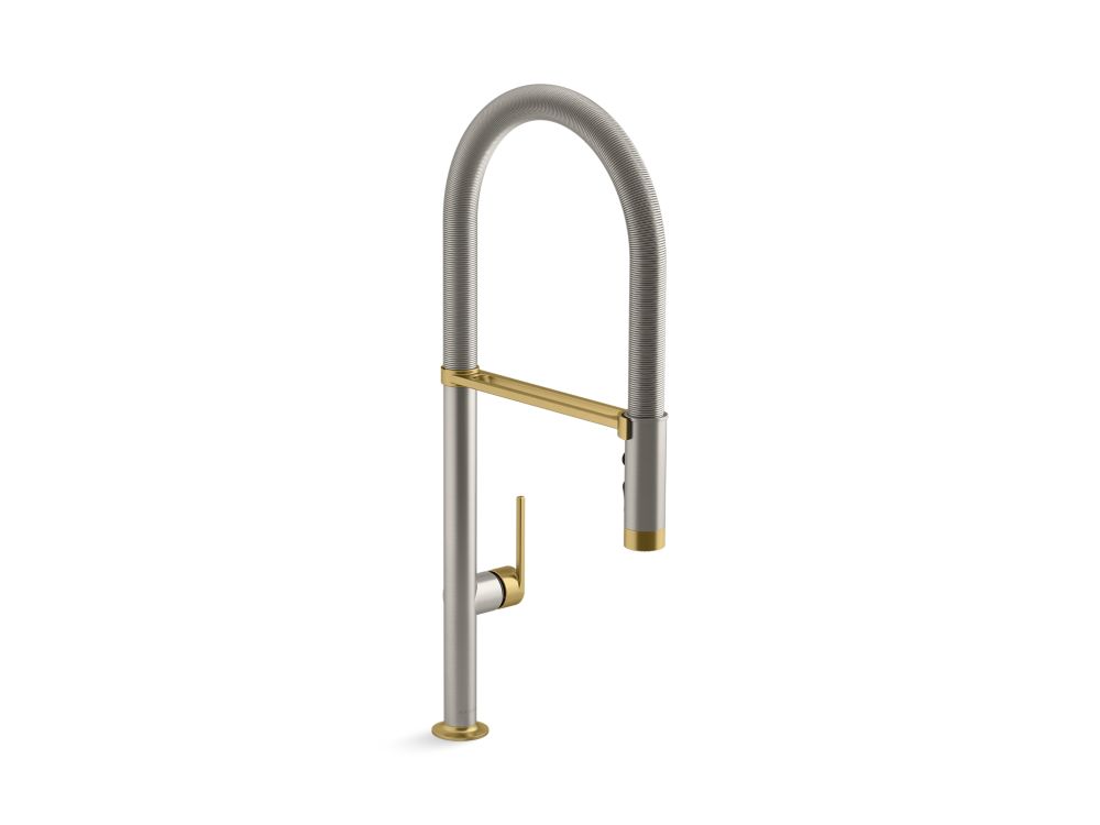 Juxtapose™ by Mick De Giulio is a stylish kitchen collection designed to delight both novice and kitchen connoisseurs. Modern in approach with a chic palette of single and mixed-metal physical vapor deposition (PVD) finish combinations, Juxtapose features slim profiles and sophisticated details. Pivotal to the series is the Juxtapose semi-professional kitchen faucet with the latest in KOHLER® spray technology including Sweep® spray, Boost and an aerated stream for the ultimate in functionality, performance, and reliability.
